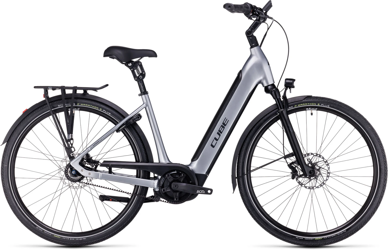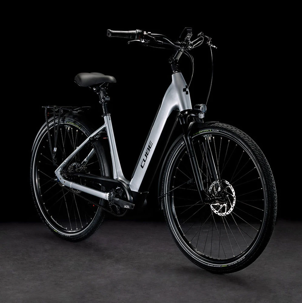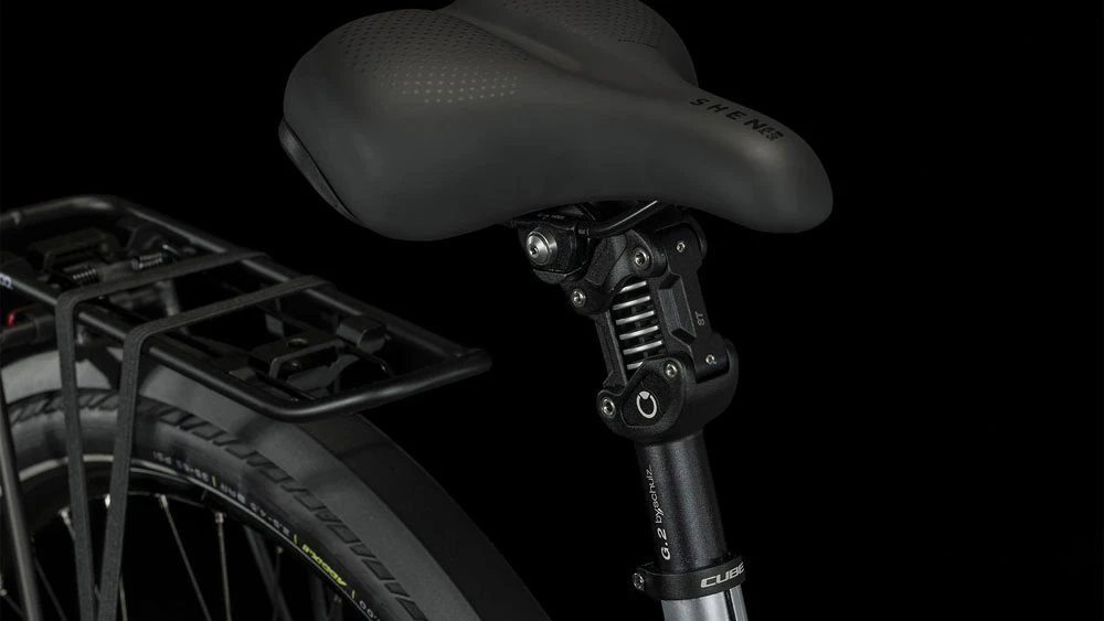 Klar, dass auch der Komfort nicht zu kurz kommt: Hierfür habt Cube dem Bike einen verstellbaren Vorbau, eine Rockshox Paragon Gold Federgabel und eine gefederte Parallelogramm-Sattelstütze von Byschulz spendiert. Einmal abgestellt, hält der integrierte Seitenständer das Bike aufrecht. Und dank Beleuchtung heißt es zu jeder Tages- und Nachtzeit: Sehen und gesehen werden. Schutzbleche und ein semi-integrierter Gepäckträger vollenden die Ausstattung.