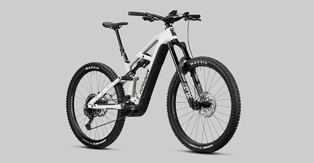 Der flügelähnliche Überwurf, welcher Ober und Unterrohr verbindet, macht nicht nur optisch was her, sondern bietet auch in technischer Hinsicht ein absolutes Highlight. Sowohl der Carbon-Hauptrahmen als auch die Trunnion-Dämpferaufnahme bewirken eine Menge Steifigkeit und Stabilität. Wie auch beim RENDER bietet die untere Dämpferaufnahme gleichzeitig einen Teil der Wippe, welche dem Rahmen eine einzigartige Kinematik und besonders hohe Stabilität des Hinterbaus verleiht. Der 750Wh große Akku wird durch eine Patrone in das Unterrohr integriert, die für geräuscharmes Fahren und einen wackelfreien Sitz sorgt. Durch eine gummierte Abdeckung, welche das Unterrohr abschließt, lässt sich der Akku problemlos und schnell entnehmen. Mittels der am Sitzrohr befindlichen Ladebuchse lässt sich der Akku ohne Entnahme laden. Das Schaltwerk wird am neuen, herstellerübergreifend genormten UDH hanger montiert, der Speedsensor ist elegant in der Bremsscheibe und Kettenstrebe integriert, sodass der klassische Speichenmagnet der Vergangenheit angehört.