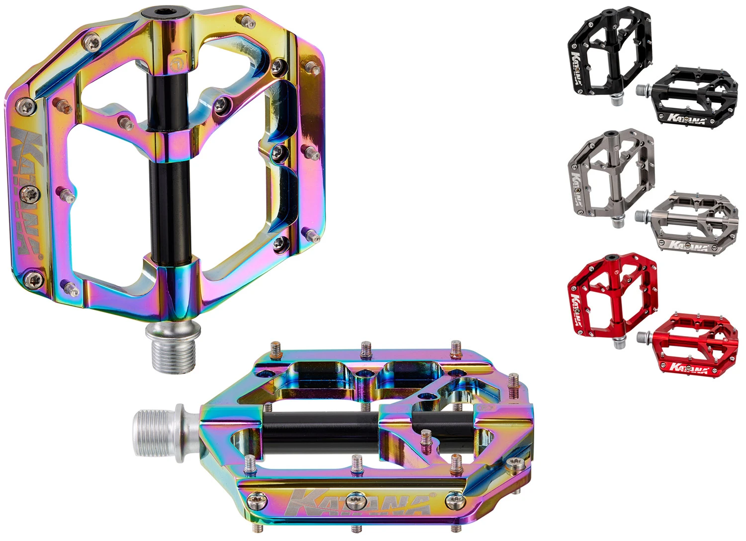 Die E-Blade Plattformpedale von Katana verfügen über einen leichten Aluminium-Korpus, eine durchgehende Pedalachse und extralange Pins für optimalen Grip. Dank der hochwertigen Industrielager und der soliden Bauweise sind diese flachen MTB-Pedale auf eine lange Lebensdauer und größtmögliche Vielseitigkeit ausgerichtet. So sind sie nicht nur für alle Situationen vom anspruchsvollen Trail bis zur täglichen Pendelstrecke geeignet, sondern machen sich auch am Trekkingrad oder E-Bike gut!