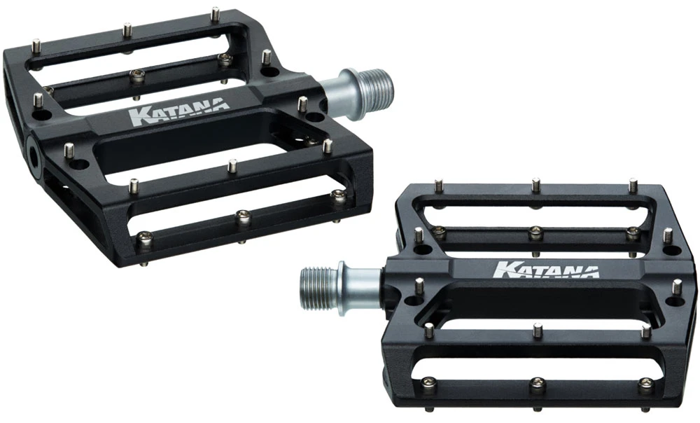 Die flachen Ground Control Plattformpedale von Katana bestehen aus einem robusten Aluminium-Korpus und sind jeweils mit 10 Pro-Pins für den nötigen Grip auf allen Trails versehen. Der Alu-Pedalkörper und die CNC-gefrästen Achsen sorgen in Verbindung mit hochwertigen Kugellagern für eine hohe Lebensdauer in jedem Einsatzbereich, selbst unter härtesten Bedingungen. Ground Control ist flach, robust und schnell!