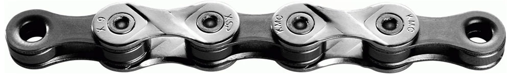 Die extrem haltbare X9 9-fach Kette von KMC ohne Laufrichtungsabhängigkeit und vernickelten Außenlaschen für 9-fach Schaltsysteme.