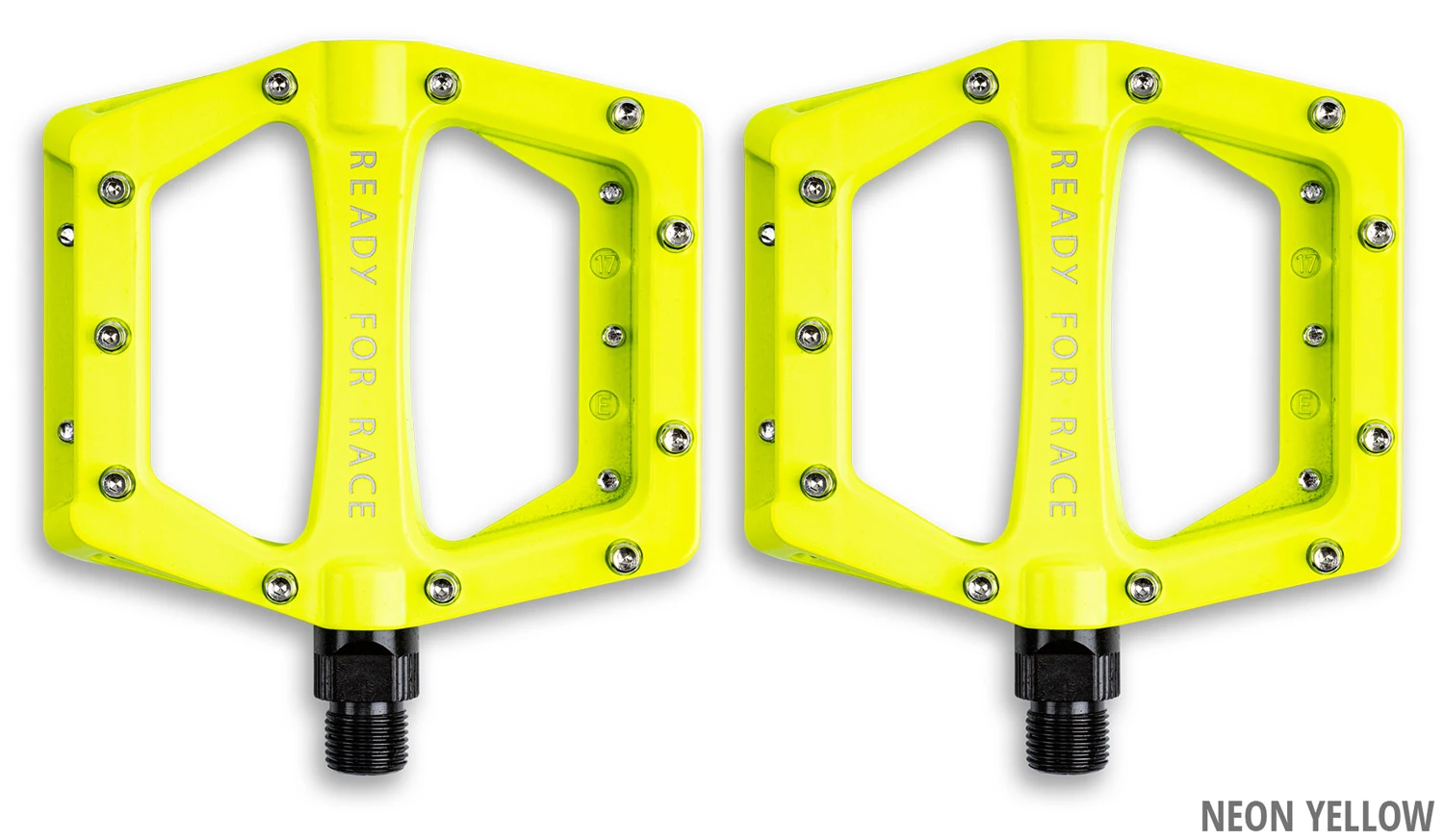 Die leichten RFR Flat-Pedale sind aus Aluminium hergestellt und werden mit einer Cr-Mo-Achse verbaut. Die Anti-Rutsch-Pins sind austauschbar und bieten besten Halt am Fahrrad.