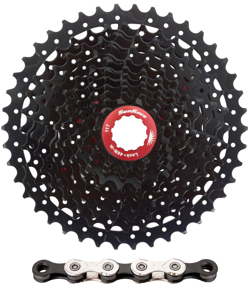Das Verschleissset für 11-fach Schaltsysteme bestehend aus der SunRace MX8 Kassette mit 11-46 Zähnen und der KMC X11-93 Kette mit 114 Gliedern.
