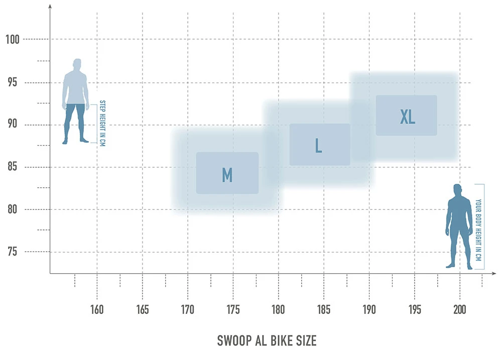 Mit Hilfe unserer Grafik wollen wir Dir eine Empfehlung bei der Suche nach Deiner richtigen Rahmengröße geben. Neben Schrittlänge sowie Körpergröße spielt natürlich auch Dein persönlicher Fahrstil, Einsatzbereich sowie Vorliebe eine große Rolle. Wenn Du mit Deinen Angaben im Grenzbereich liegen solltest, kannst Du zwischen zwei Rahmenhöhen wählen: die kleinere Rahmengröße ist agiler/wendiger/verspielter, die nächstgrößere Rahmenhöhe laufruhiger/spurtreuer und hat im Uphill die Nase vorn.